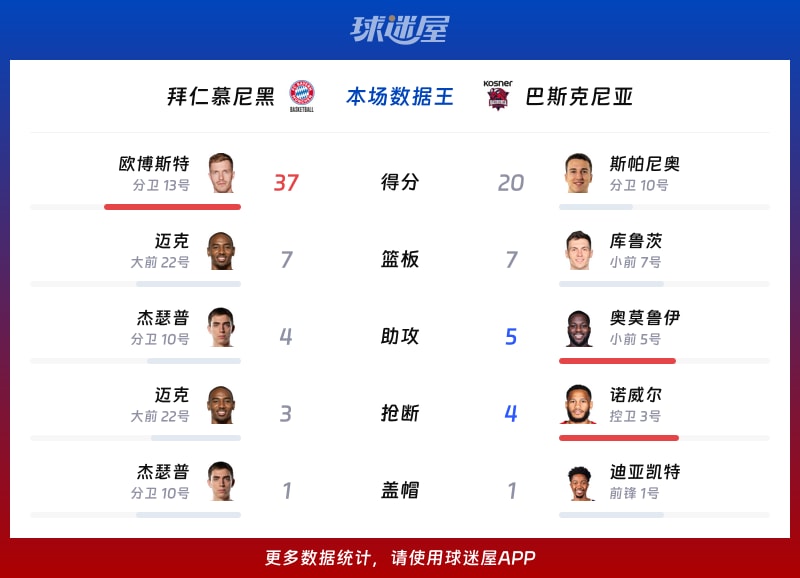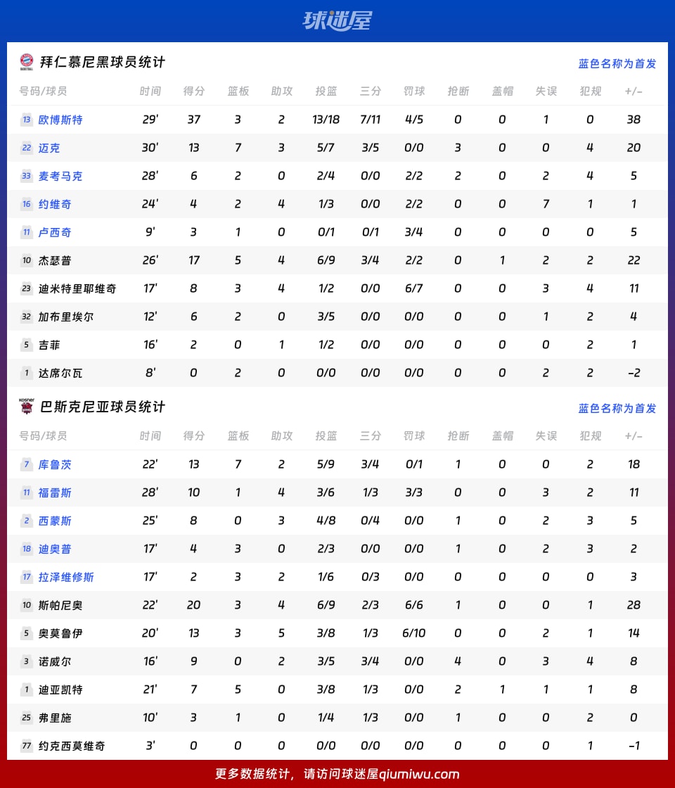 拜仁慕尼黑:欧博斯特37分、迈克13分、麦考马克6分、约维奇4分、卢西奇3分