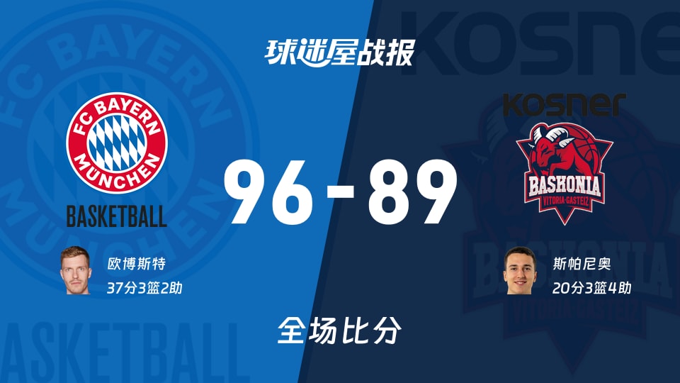 球迷屋1月8日讯,2025-2026赛季欧篮联常规赛继续进行中,本场比赛由拜仁慕尼黑主场迎战巴斯克尼亚,经过刺激对决,最终拜仁慕尼黑凭借主场优势,锐不可当,以96-89战胜巴斯克尼亚。拜仁慕尼黑:欧博斯特37分3板2助、杰瑟普17分5板4助、迈克13分7板3助;巴斯克尼亚:斯帕尼奥20分3板4助、库鲁茨13分7板2助、奥莫鲁伊13分3板5助。